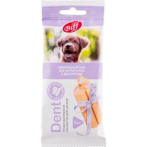 Лакомство для щенков мелких и средних пород Biff Dent с йогуртом - это вкусное и полезное угощение для вашего питомца. Вес составляет 40 грамм. Идеально подходит для щенков, которые только начинают чистить зубы, а также для тех, кто имеет проблемы с зубами и деснами.