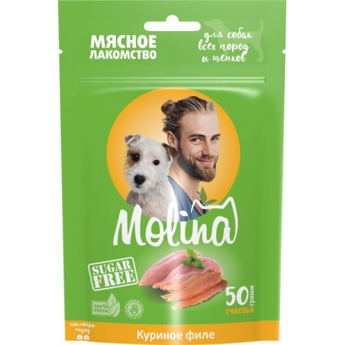 Лакомство для собак и щенков MOLINA Куриное филе, для всех пород, 50г в магазинах Лента