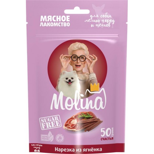 Лакомство для собак и щенков MOLINA Нарезка из ягненка, для мелких пород, 50г в магазинах Лента