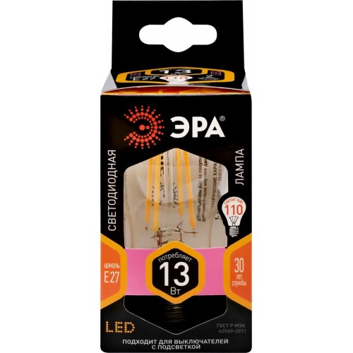 Лампа светодиодная ЭРА F-LED A60-13W-827-E27, 13Вт, филамент, груша, теплый белый свет, Арт. Б0035027 в магазинах Лента