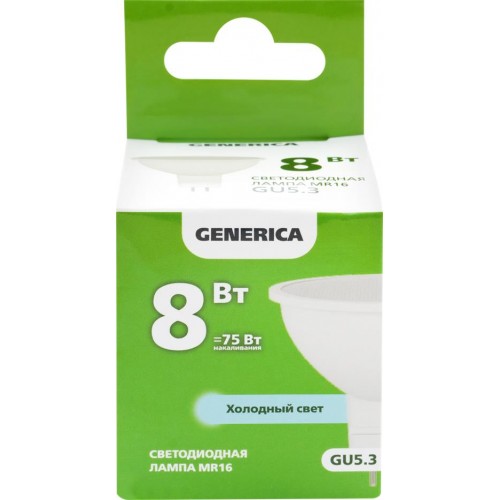 Лампа светодиодная MR16 софит 8Вт 230В 6500К от бренда GENERICA - идеальный выбор для общего освещения общественных, коммерческих и жилых помещений! Благодаря мощности 8 Вт и цветовой температуре 6500 К, эти лампы обеспечивают мягкий и безопасный свет, не утомляющий глаза.