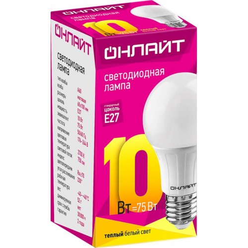 Лампа светодиодная ОНЛАЙТ 10Вт E27, теплый свет, груша Арт. 71649 в магазинах Лента