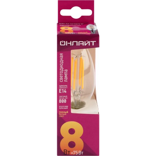 Лампа светодиодная ОНЛАЙТ 8Вт 2700К Е14 свеча, филамент, Арт. 80892 в магазинах Лента