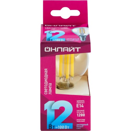 Лампа светодиодная ОНЛАЙТ LED 12Вт, 4000К, Е14, шар, филамент Арт. 80891 в магазинах Лента