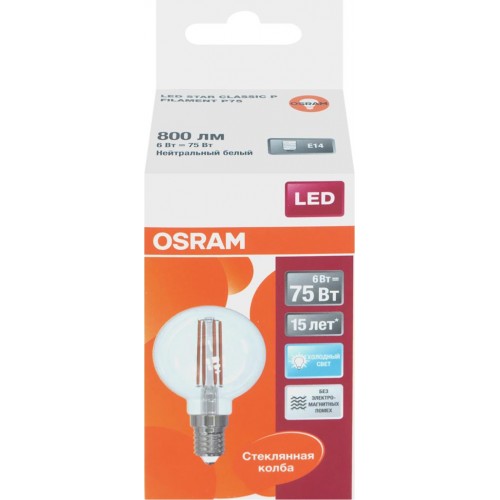 Лампа светодиодная OSRAM LED Star, 6Вт, E14, 4000К, нейтральный белый свет, шар в магазинах Лента