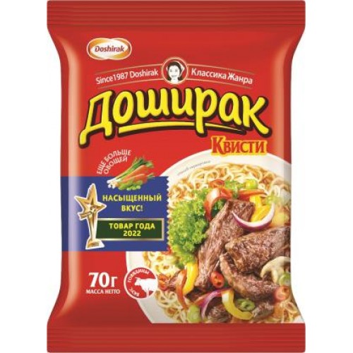 Лапша Доширак Квисти со вкусом говядины – это идеальное решение для быстрого и вкусного обеда. Вес продукта составляет 70 грамм. В состав входят макаронные изделия из высококачественной пшеничной муки, а также пакетик с пряностями, сушеными овощами и бульоном-приправой, который придает готовой лапше неповторимый вкус и аромат. Уникальная технология производства позволяет сохранить все полезные свойства продуктов. Благодаря красному перцу в составе бульон получается в меру острым, что делает блюдо еще более аппетитным. Лапша Доширак Квисти – это отличный выбор для тех, кто ценит свое время и любит вкусно поесть. Готовьте с удовольствием!