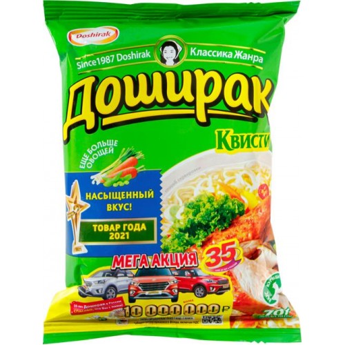 Ароматное блюдо на каждый день - суп-лапша или гарнир - станет настоящей находкой для тех, кому важен быстрый и вкусный обед. Лапша DOSHIRAK Квисти идеально подходит для студентов, офисных работников и всех, кто хочет быстро и недорого перекусить.