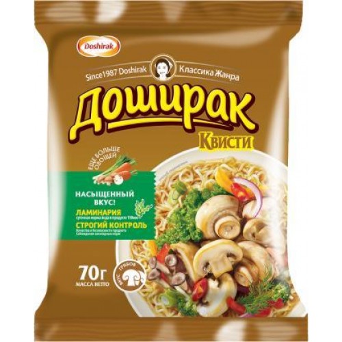 Лапша Доширак Со вкусом грибов 70 г - это порция быстрого и сытного блюда, состоящего из макаронных изделий в форме спирали и овощного бульона-приправы. В упаковке также находятся сушеная морковь, ламинария и лук, которые прекрасно дополняют вкус блюда. Чтобы приготовить лапшу, необходимо поместить все ингредиенты в глубокую тарелку, залить их горячей водой (примерно 95-100 градусов) и накрыть крышкой или тарелкой на 5 минут. Готовую лапшу можно подавать как самостоятельное блюдо или с овощным салатом. Ее также можно использовать для приготовления бургеров, теплых и холодных салатов, а также блюд китайской кухни.