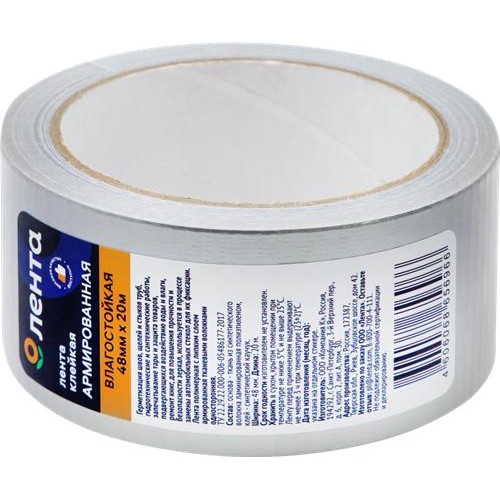 Лента клейкая влагостойкая АРМИРОВАННАЯ СЕРЕБРИСТАЯ размером 48 мм х 20 м, предназначена для герметизации швов, щелей, стыков труб, а также корпусов и теплоизоляционных материалов. Продукт подходит для гидротехнических и сантехнических работ, запечатывания тары и защиты товаров от влаги. С его помощью можно осуществлять ремонт книг и других изделий.