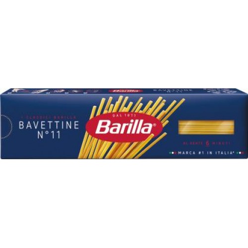 Макароны Barilla Bavettine №11 - это плоская длинная паста без дырочек внутри, изготовленная из твёрдых сортов пшеницы. Вес продукта составляет 450 г. Макароны отлично подходят для приготовления разнообразных блюд и хорошо сочетаются с густым томатным соусом, благодаря чему они сильно увеличиваются в размере, сохраняя при этом свою форму и не слипаясь.