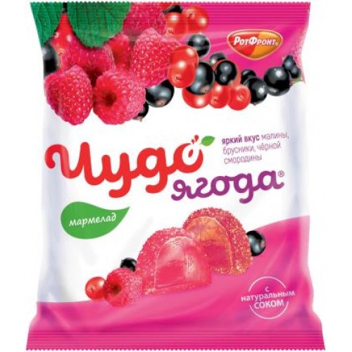 Мармелад Чудо-Ягода представляет собой ассорти из трех вкусов лесных ягод: Малина, Брусника и Черная смородина. Продукт имеет вес 250 грамм.