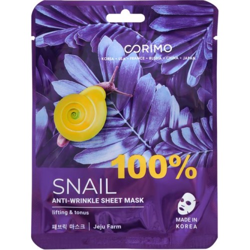 Маска для лица CORIMO Сокращение морщин 100% Snail - это эффективное средство для ухода за кожей, обладающее выраженным омолаживающим действием. Благодаря высокому содержанию экстракта слизи улитки, маска уменьшает глубину и количество морщин, интенсивно питает и увлажняет кожу, повышая ее упругость и эластичность.