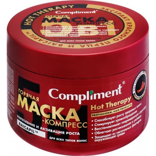 Маска COMPLIMENT Hot Therapy - это идеальное средство для предотвращения выпадения и ускорения роста густых, сильных и здоровых волос. Она подходит для любого типа волос и не имеет ограничений по возрасту, благодаря своей уникальной формуле.