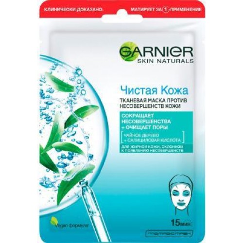 Маска тканевая Garnier Чистая Кожа, 32 г - идеальное решение для обладательниц жирной кожи с черными точками и видимыми порами! Обогащенная чайным деревом и салициловой кислотой формула маски обеспечивает интенсивное очищение и сокращение несовершенств. Действует как увлажняющий компресс, освежает и разглаживает кожу. Маска удобна в применении – легко наносится, снимается и не ограничивает движения. Заметные результаты заметны уже после использования 3 масок за неделю.