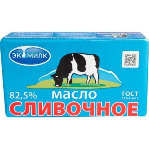 Товар представляет собой сливочное масло Экомилк с массовой долей жира 82,5%, упакованное в пачку весом 380 грамм.