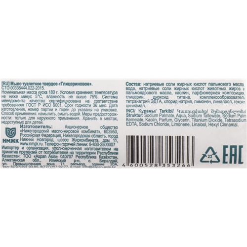 Натриевые соли жирных кислот пальмового масла, вода, натриевые соли жирных кислот животных жиров и пальмоядрового масла, каолин,парфюмерная композиция, глицерин, диоксид титана, комплексообразователь тетранатрий ЭДТА, хлорид натрия, гексил циннамал, лимонен,линалоол.