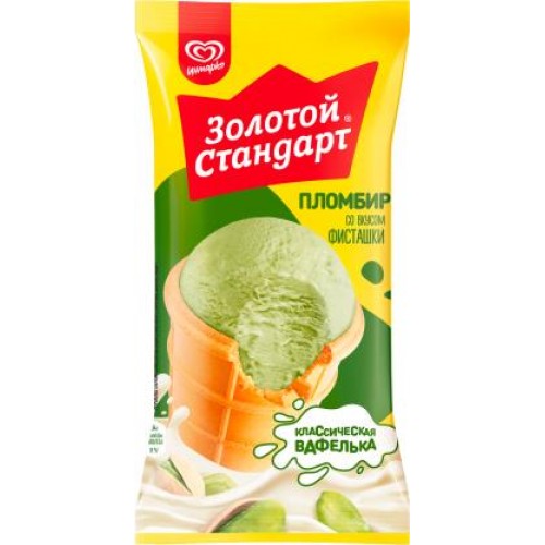 Мороженное Золотой стандарт пломбир вафельный стаканчик фисташка 84г в магазинах Магнит