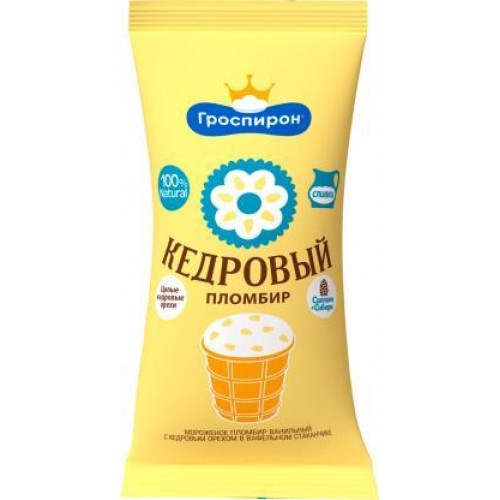 Название товара: Мороженое Гроспирон Кедровый Пломбир с кедровым орехом, в вафельном стакане, 15%, 85 г