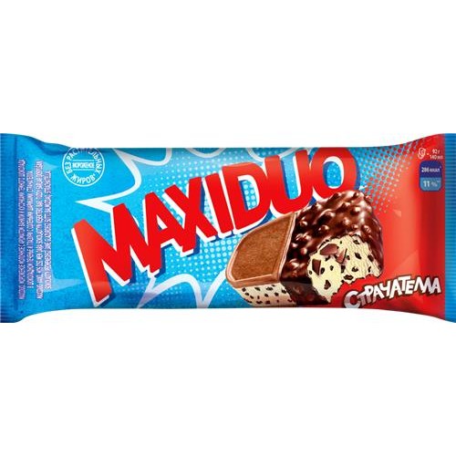 Мороженое MAXIDUO Страчателла - это неповторимый дуэт нежного молочного мороженого с ароматом ванили, кусочками темного шоколада и освежающими солеными шариками, покрытый шоколадным печеньем и глазурью.