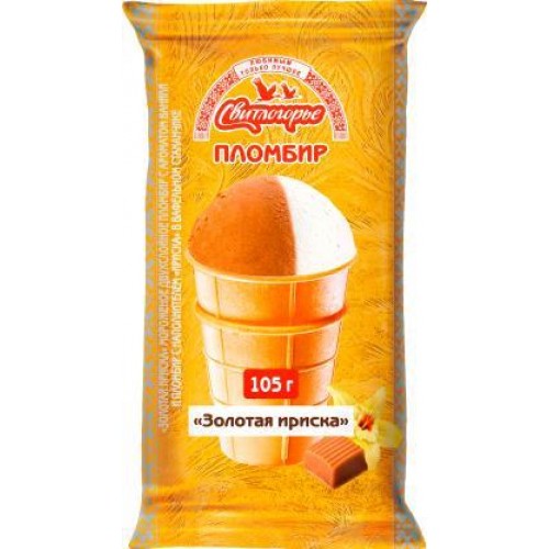 Мороженое Свитлогорье «Золотая Ириска» - это двухслойный десерт, состоящий из ванильного и пломбирного слоев. Вес мороженого составляет 105 грамм.