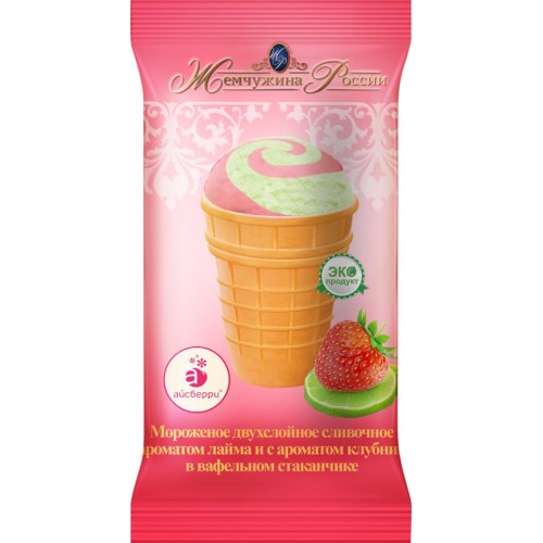 Мороженое ЖЕМЧУЖИНА РОССИИ Сливочное двухслойное с ароматом лайма и с ароматом клубники 9,5%, без змж, вафельный стаканчик, 90г в магазинах Лента