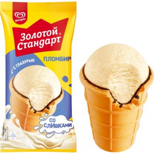 Золотой стандарт мороженое пломбир в вафельном стаканчике «Классический» со вкусом сливок – это полностью натуральный продукт весом 86 грамм. Он состоит из густого сливочного пломбира, покрытого хрустящей вафельной оболочкой и сладкой глазурью.