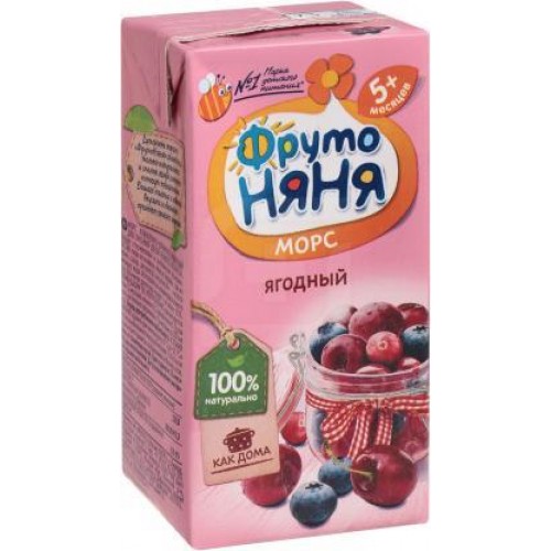 Товар «Морс ФрутоНяня Ягодный» объемом 200 мл предназначен для детского питания. Он изготовлен из натуральных ингредиентов – клюквы, черники и вишни, без добавления ароматизаторов, красителей и консервантов, благодаря чему имеет мягкий вкус и нежный аромат. Морс полезен для зрения (благодаря черничным плодам), пищеварения (благодаря вишне) и общего здоровья (благодаря клюкве и калию в составе). Суточная норма употребления составляет 100 мл. Продукт можно давать детям, начиная с 5-месячного возраста.