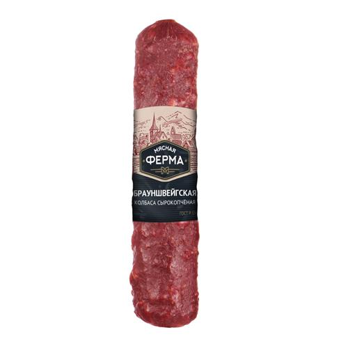 Мясной продукт. Изделие колбасное сырокопченое, колбаса Мясная ферма Брауншвейгская полусухая кат.А ГОСТ мал.батон в/у шт.300г в магазинах Пятерочка