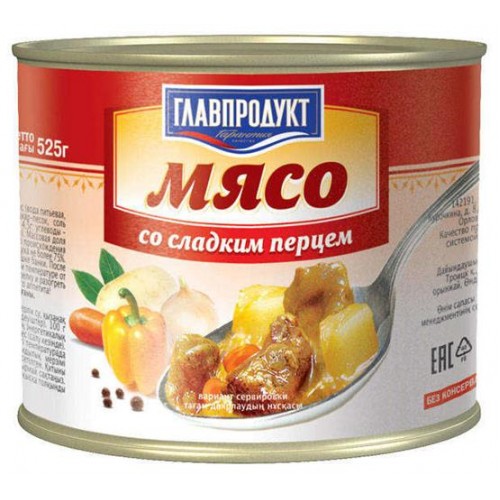 Мясо говяжье ГЛАВПРОДУКТ со сладким перцем в томате, 525 г (kastd) в магазинах Ашан