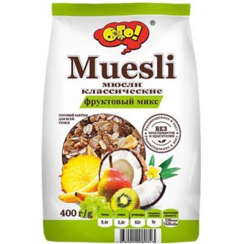 Мюсли Ого! Классические Фруктовый микс весом в 400 грамм – это идеальный вариант быстрого, вкусного и полезного завтрака для всей семьи. Обладая весом в 350 грамм, этот продукт представляет собой смесь пшеничных, ржаных, ячменных и овсяных хлопьев, которые являются источниками необходимых для организма пищевых волокон. Кусочки свежих фруктов и сладкие цукаты добавляют изысканный вкус, а полезные жиры представлены в виде семян подсолнечника.