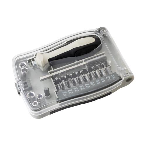 В состав набора входят: углеродистая сталь (биты), полистирол (бокс), полипропилен и термопластичная резина (рукоятка и магнитный удлинитель). В комплекте присутствуют 5 торцевых головок размером 5, 6, 7, 8 и 9 миллиметров и 21 бит различных форм и размеров, которые легко устанавливаются на рукоятку. С помощью магнитного удлинителя можно легко работать с мелкими деталями, не опасаясь их потери.