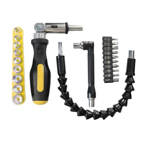 В комплект входят 22 различных предмета: 10 бит, 9 торцевых головок, угловая рукоятка-трещотка, угловая рукоятка и гибкий переходник. Все элементы изготовлены из высококачественных материалов: углеродистой стали, полипропилена, термопластичной резины, АБС и ПВХ.