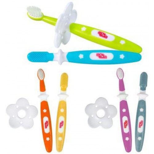 Эти щетки разработаны для постепенного обучения детей самостоятельной чистке зубов. С появлением первого зуба можно начать приучать ребенка к ощущениям от зубной щетки во рту, делая соответствующие движения. Кольцо-ограничитель защищает горло от контакта со щеткой.