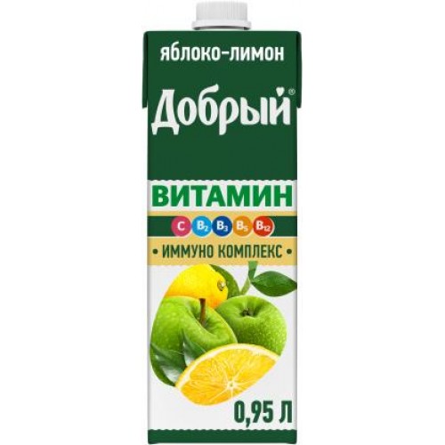 Напиток Добрый 950 мл сокосодержащий, яблоко-лимон с уникальным витаминным ИММУНО комплексом, специально подобранными фруктами и ягодами для поддержки иммунитета, содержит витамины, которые способствуют правильной работе пищеварения, улучшают энергетический обмен в организме, помогают усвоению пищи, восстановлению иммунной системы и улучшению функционирования иммунной системы. Не содержит консервантов. Упаковка может быть цветной или белой.