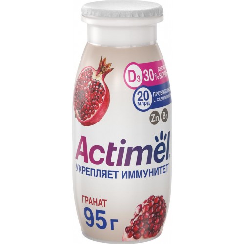Напиток кисломолочный Гранат с цинком 1,5% от торговой марки ACTIMEL - идеальное средство для ежедневного укрепления вашего иммунитета. Бутылочка этого продукта является супермиксом, состоящим из 20 млрд пробиотиков L.Casei Imunitass и витаминов B6 и D3, что в свою очередь способствует увеличению защитных функций организма. А недавно добавленный цинк только усиливает этот эффект.