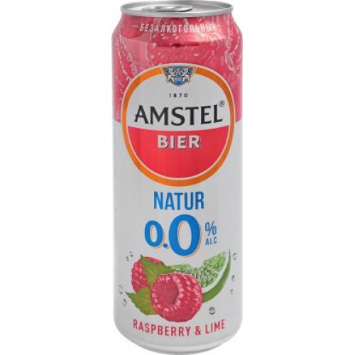 Напиток пивной Amstel Малина и лайм, безалкогольный, нефильтрованный, осветленный, пастеризованный, 0%, 430 мл, на основе пива. Яркий оригинальный вкус благодаря светлому ячменному пивоваренному солоду и хмелепродуктам с добавлением концентрированных соков (цитрусовые - лимонный, лаймовый, апельсиновый и малиновый). Насыщенный вкус с хорошим балансом кислинки и сладости, включая оттенок мятного масла в составе. Розовый цвет, сильногазированный, пенистый. Отлично утоляет жажду, охлаждает и бодрит. Лучше употреблять охлажденным. Продаётся в привлекательной жестяной банке.