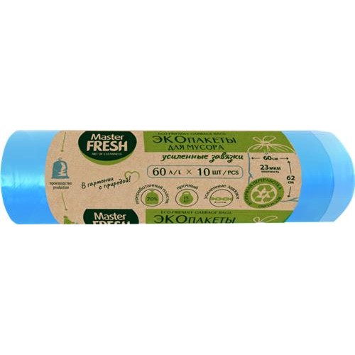 Пакеты для мусора MASTER FRESH Eco 60 литров, с усиленными завязками, голубые, 10шт в магазинах Лента