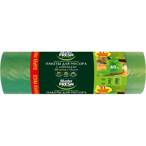 Пакеты для мусора MASTER FRESH XXL, с завязками, 60л, зеленые, 15шт в магазинах Лента