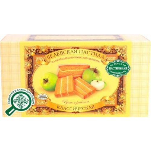 Описание: Белевская пастила «Яблоко» 200г - это изысканный и вкусный десерт, изготовленный из всего трех ингредиентов: запеченной мякоти яблок, сахара и яичного белка. Этот воздушный бисквит, напоминающий бисквит по виду, покрывается яичным белком, соединяются и обсыпаются сахарной пудрой, после чего выдерживается в печи в течение нескольких часов для полного пропитывания. В результате мы получаем продукт с нежным и ароматным фруктовым вкусом, тающим во рту.