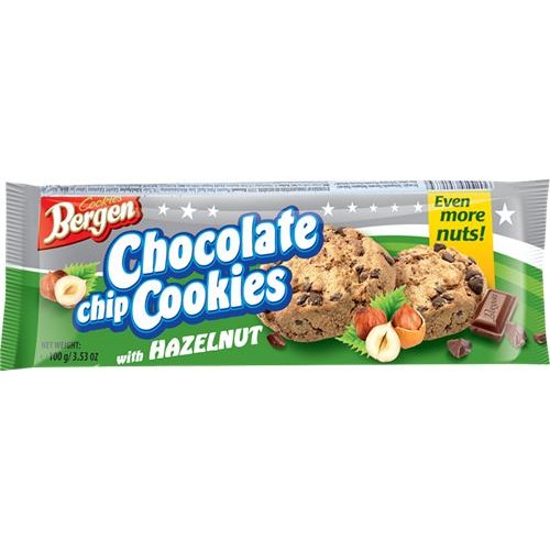 Печенье BERGEN Chocolate chip cookies с кусочками шоколада и лесным орехом, 100г в магазинах Лента