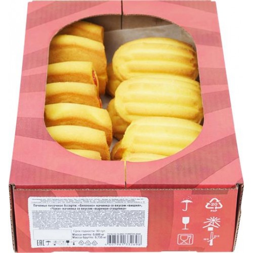 Мука пшеничная хлебопекарная высшего сорта, маргарин твердый Столовый с Молочным вкусом и ароматом (рафинированныедезодорированные масла в натуральном и модифицированном виде (пальмовое масло и его фракции, подсолнечное масло), вода питьевая,эмульгаторы (моно и диглицериды жирных кислот, полиглицерина и жирных кислот), соль пищевая, ароматизатор Сливки-молоко, красителькаротиновый, регулятор кислотности лимонная кислота), маргарин для песочных изделий (рафинированные дезодорированные масла снатуральном виде (пальмовое масло и его фракции, подсолнечное масло, пальмоядерное масло), вода питьевая, эмульгаторы (Е471, Е475,соевый лецитин), соль пищевая, краситель Е160а, ароматизатор, регулятор кислотности лимонная кислота), начинка фруктовая вишневая(сироп глюкозно-фруктозны