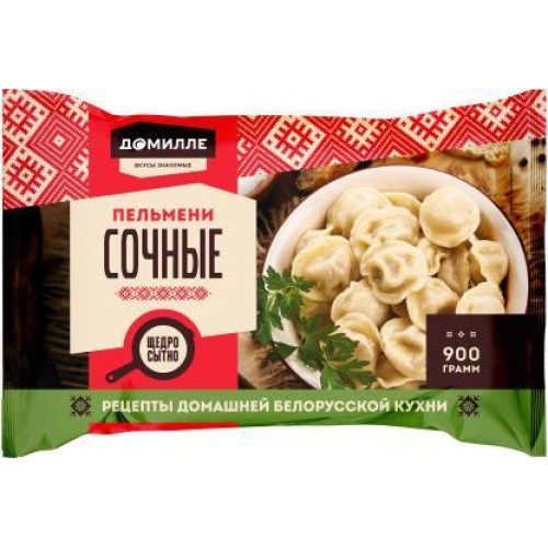 Название товара: Пельмени Домилле Сочные, 900 г. Производитель: Петербургские производители. Описание: Вдохновленные рецептами домашней белорусской кухни, эти пельмени имеют начинку из трех видов мяса - говядины, свинины и курицы. Добавление черного перца, горчицы и молочного белка делает начинку особенно вкусной и сочной. Благодаря особому способу лепки, пельмени получаются с бульоном внутри, что придает им особую сочность. Вес: 900 г.