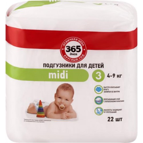 Подгузники детские 365 ДНЕЙ Midi 4–9кг, 22шт в магазинах Лента