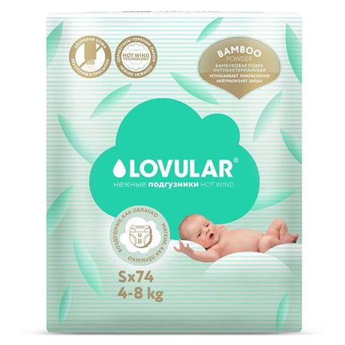 Подгузники Lovular Hot Wind Bamboo Powder S 4-8 кг, 74 шт (kastd) в магазинах Ашан