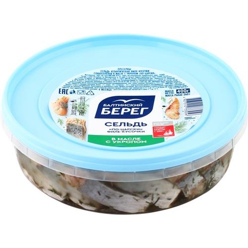 Пресервы: Сельдь БАЛТИЙСКИЙ БЕРЕГ атлантическая филе-кусочки слабосоленая в масле с укропом По-царски 0,4 кг. в магазинах Лента