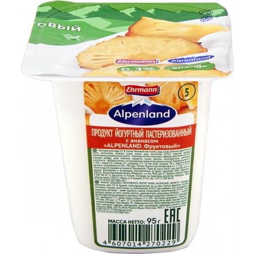 Продукт йогуртный EHRMANN Alpenland Киви, крыжовник, ананас 0,3%, без змж, 95г в магазинах Лента
