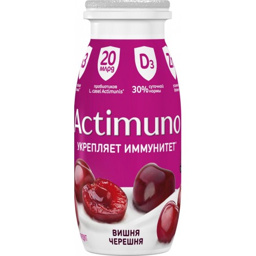 Молоко нормализованное, сахарный сироп (сахар, вода), наполнитель (вода, пюре вишни, сахар, сок черешни концентрированный,стабилизатор Е1442, ароматизатор, сок черной моркови концентрированный, регулятор кислотности Е331(iii), глюконат цинка (источникцинка)), глюкоза, витамин B6, витамин D3, йогуртовая закваска, лактобактерии L. casei Actimunis. Содержание молочнокислыхмикроорганизмов – не менее 1х107 КОЕ/г. Содержание лактобактерий L. сasei Actimunis – не менее 2,2х108 КОЕ/г.