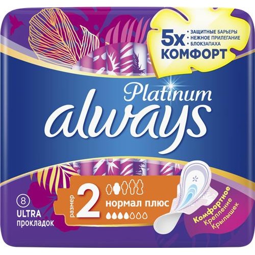 Прокладки ALWAYS Platinum Нормал Плюс, ультратонкие, с крылышками, 8шт в магазинах Лента