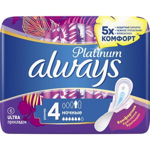 Предназначение: Гигиенические ночные прокладки ALWAYS Platinum (размер 4) рекомендуются для использования ночью или в течение дня при обильном выделении. Также вы можете выбрать ALWAYS Platinum Супер Плюс (размер 3) для ежедневного использования при средних выделениях.