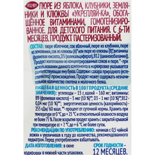 Пюре фруктово-ягодное АГУША Укрепляй-ка Яблоко, клубника, земляника и клюква, с 6 месяцев, 80г в магазинах Лента